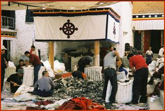 Ce matin François nous amène explorer Barkhor Square où se trouve le temple Jokhang, lieu de pèlerinage très fréquenté par les gens du pays. Il a été construit dans les années 600 pour abriter le bouddha qu'a apporté la princesse népalaise, en guise de dot, lors de son mariage avec le roi Songtsen Gampo.  Ce temple a été très endommagé par les chinois lors de la révolution culturelle des années 1960 mais il a été rebâti au cours des années 80.